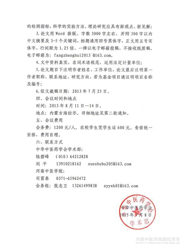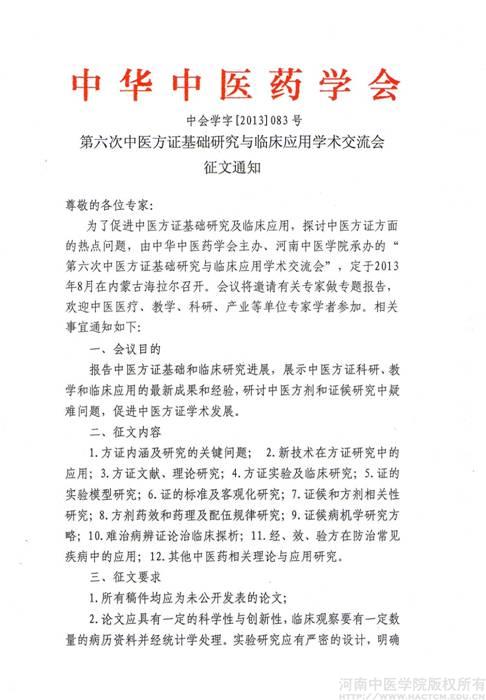 为了促进中医方证基础研究及临床应用,探讨中医方证方面的热点问题,由中华中医药学会主办、河南咕咕番 承办的“第六次中医方证基础研究与临床应用学术交流会”,定于2013年8月11日至14日在内蒙古海拉尔召开。会议将邀请有关专家做专题报告。欢迎中医医疗、教学、科研、产业等单位的专家学者参加。