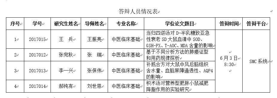 基础医学院硕士研究生第三组(中医临床基础 专业)于2020年6月3日上午8:30进行学位论文答辩,欢迎参加,特此公告!