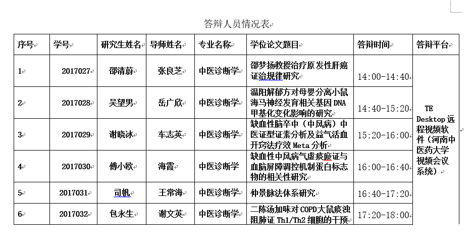 基础医学院硕士研究生第六组(中医诊断学专业)于2020年6月9日进行学位论文答辩,欢迎参加,特此公告!
