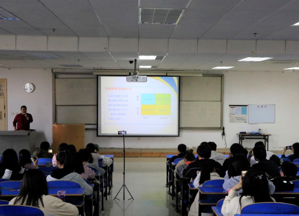 会上,赵申苒老师生动形象的讲述了沟通的技巧和要领,随后详细阐明了成为一名优秀管理者需具备的三种能力,即认识自我能力,管理者的自我管理能力和团队领导能力。最后,赵申苒老师结合自己的大学生活建议同学们重视时间、沟通与互助协调,学生骨干要善于激励、善于教练、善于领导团队建设,带动团队热情。
