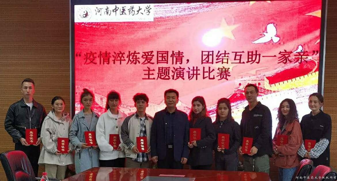 比赛中,十位选手分别从不同角度讲述了我国新疆人民抗击新冠肺炎疫情的生动故事,阐述了我国国家制度和治理体系的强大生命力和巨大优势。其中还有同学参与抗疫一线,分享了自己及其亲友抗击疫情的动人故事,以抗击疫情中的爱国主义为主题,用小切口、身边事呈现大疫情、大历史,讲述新疆抗疫故事和河中医青年担当。经过激烈角逐,2020级预防医学本科班学生夏依旦·克依木荣获一等奖。演讲结束后,努尔比耶老师进行了精彩点评,她对选手们的表现给予了充分肯定,同时对每一位选手的演讲技巧进行现场指导。随后,徐里副书记发言。他指出,本次比赛不仅弘扬了伟大抗疫精神,有效传播了正能量,更是一次同少数民族同学很好的交流机会,希望同学们自立自强,自觉维护名族团结;以校为家、快乐成长;互助提升,弘扬民族精神。最后,由徐里副书记为获奖同学颁发荣誉证书并合影留念。