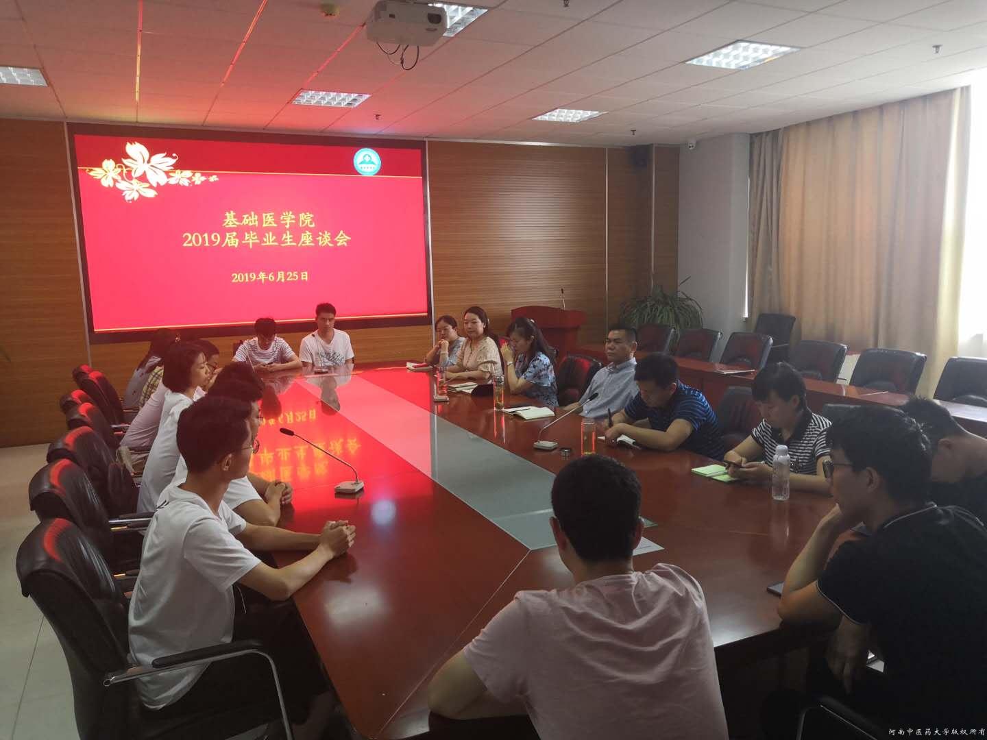 6月25日上午,基础医学院2019届毕业生代表座谈会在学院四楼会议室举行,基础医学院院长李根林、党委副书记徐里、副院长曹珊、全体辅导员及2019届10余名毕业生代表参加了此次座谈会,座谈会由徐里副书记主持。