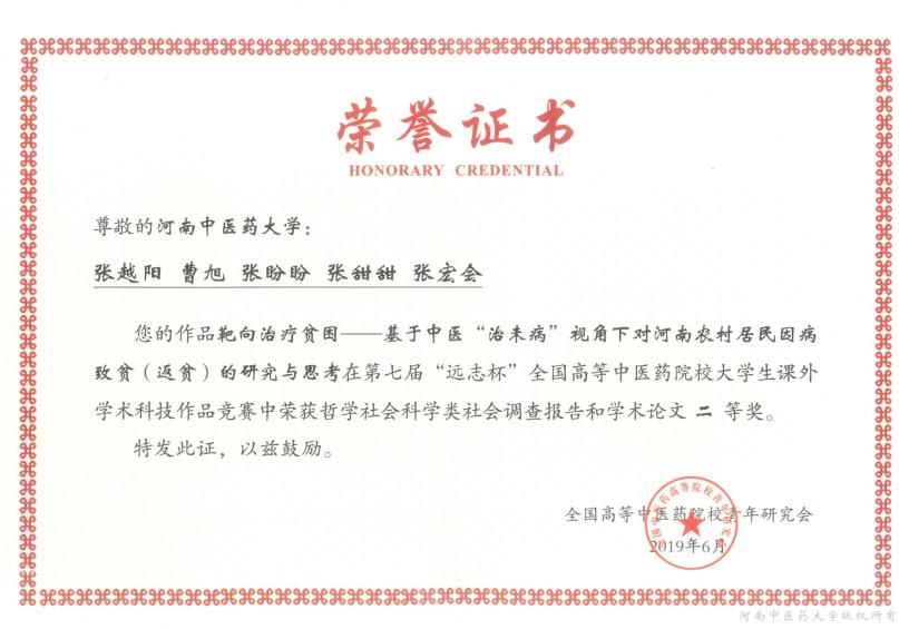 本年度咕咕番 在校本科生共申报12件作品参与“挑战杯”;58件作品参与互联网+;3件作品参与“远志杯”,参赛作品总量创历史新高。其中2016级仲景班张越阳团队的作品《靶向治疗贫困——基于中医“治未病”视角下对河南农村居民因病致贫(返贫)的研究与思考》在第七届“远志杯”全国高等中医药院校大学生课外学术科技作品竞赛中荣获二等奖,并在“挑战杯”大学生课外学术科技作品竞赛中荣获省级二等奖。2015级仲景班黄萍萍团队的作品《中医药在国家级贫困县乡镇医疗单位防治慢性病的现状研究》在2019年“挑战杯大学生课外学术科技作品竞赛中荣获省级二等奖。这些优异成绩的取得体现了基础医学院良好的育人成效。