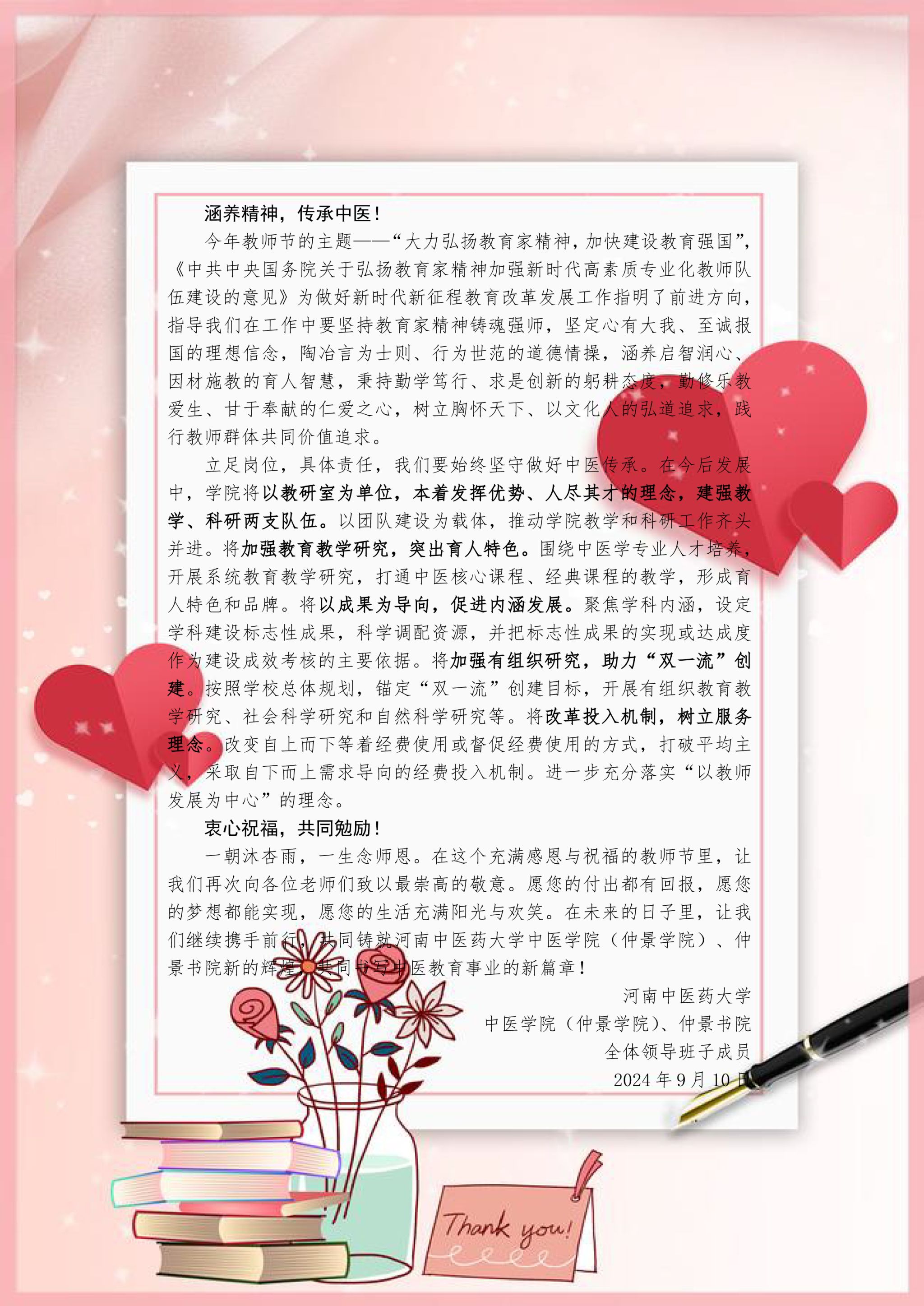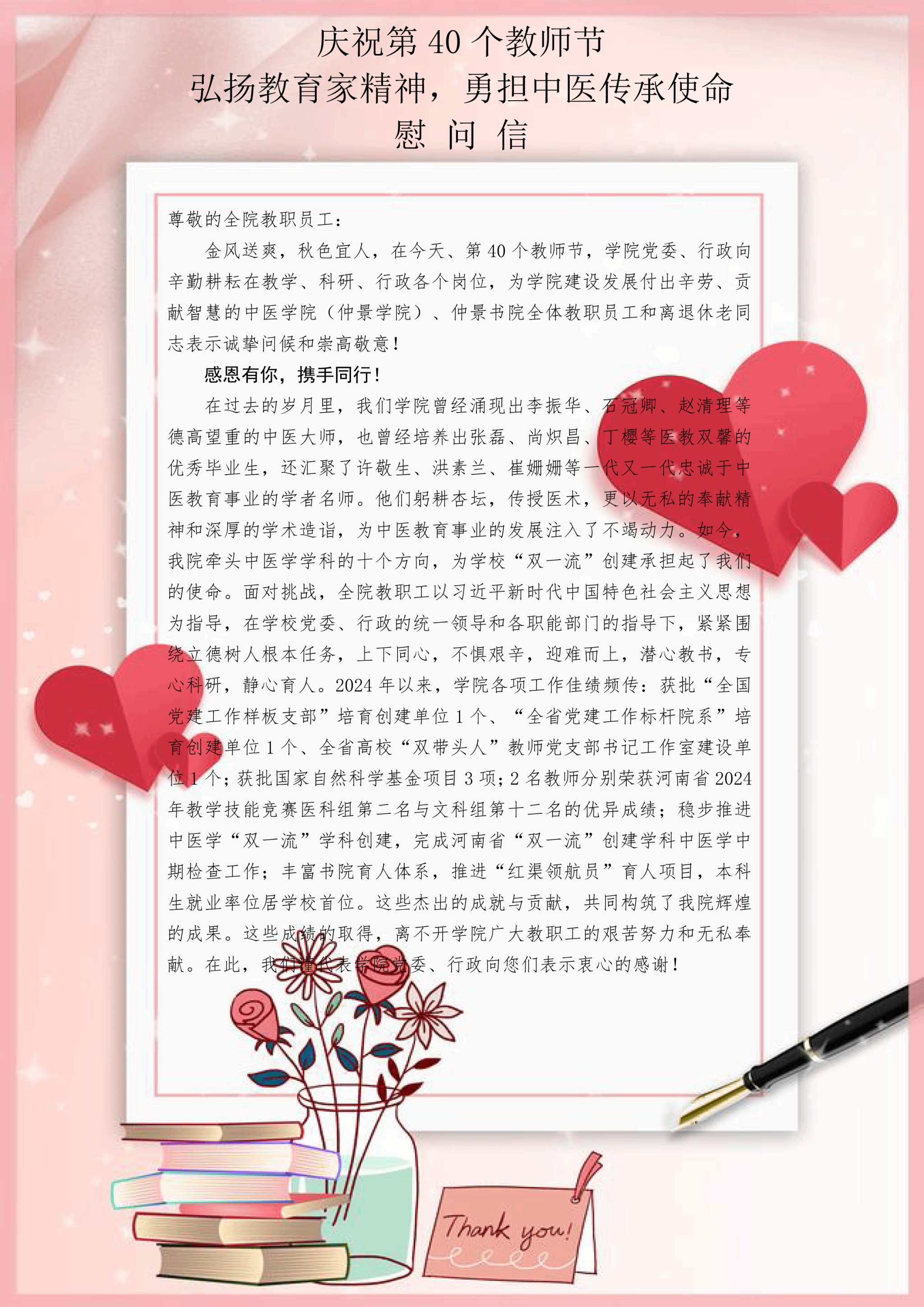 庆祝第40个教师节 弘扬教育家精神,勇担中医传承使命 慰问信