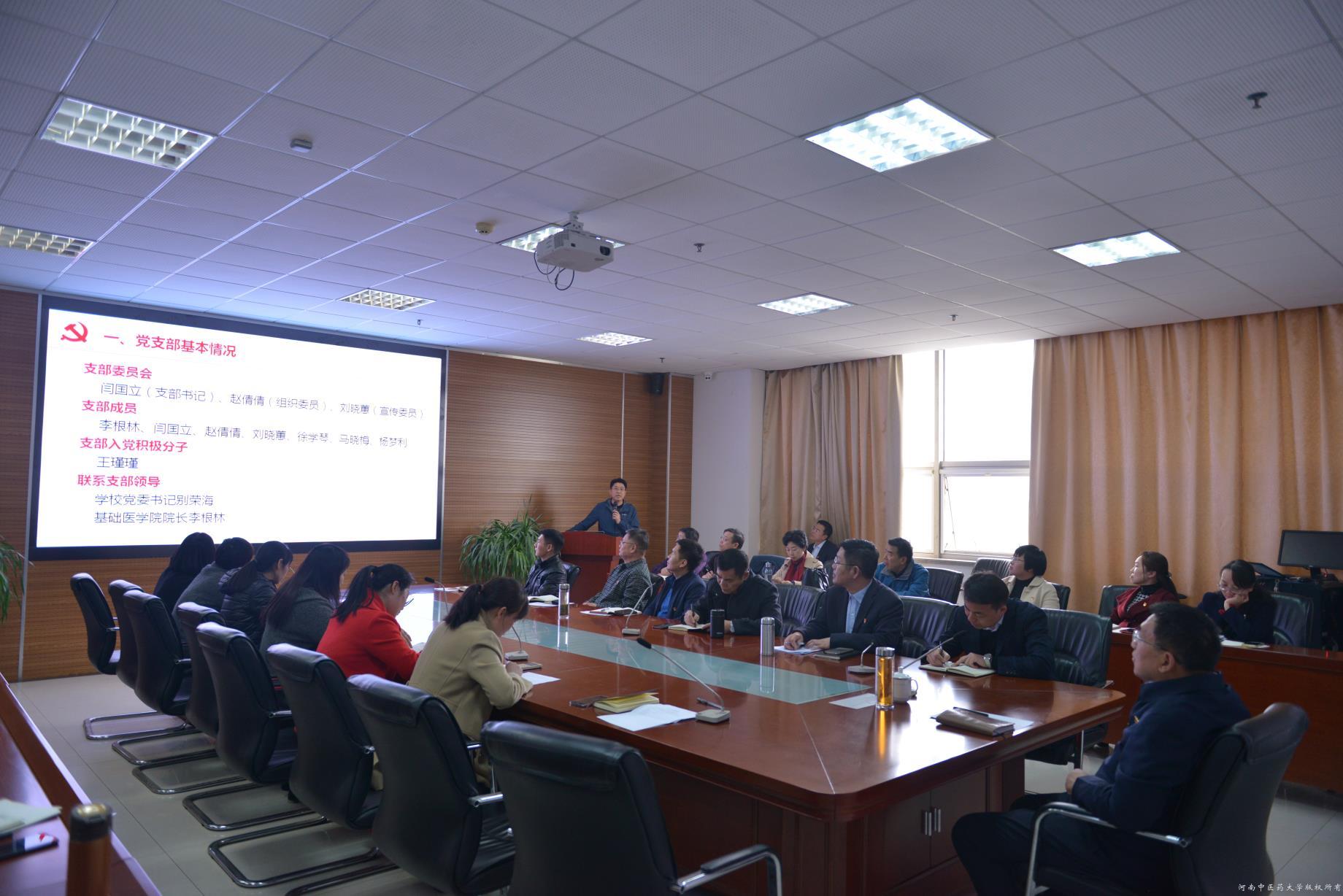 (文/闫国立 图/史占江)2019年4月9日下午,学校党委书记别荣海同志来到基础医学院(仲景学院),与所联系党支部——公共卫生与预防医学党支部全体党员一起参加了 “在专业课教学中融入思想政治教育的方式方法研讨”主题党日活动。基础医学院领导班子成员及全体党支部书记到场观摩,活动由党支部书记闫国立主持。