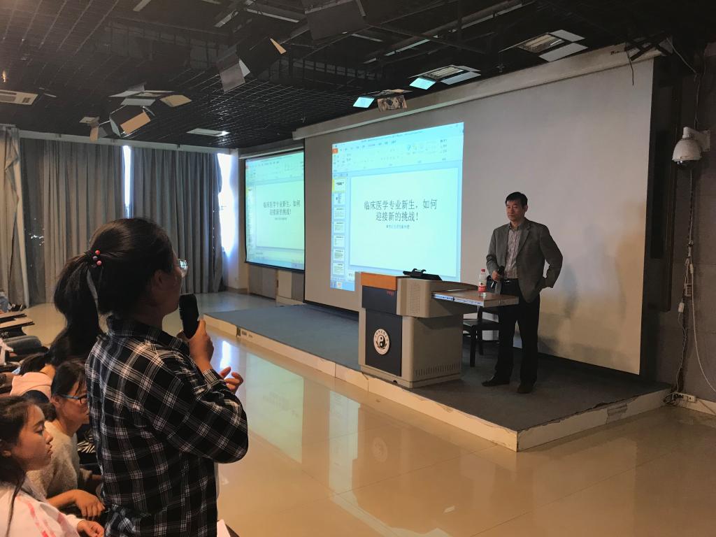 讲座中,关教授围绕中医院校开展西医专业的优势、目前该专业国内的发展情况以及专业人才培养要求和培养目标等几个方面介绍了该专业的概况,随后又详细讲述了作为临床医学专业的学生如何结合毕业后考取执业证、规培等具体内容来开展大学期间的职业规划及在校期间应该注重哪些西医理论基础的学习和在后期临床学习中应熟练具备的临床技能等内容。讲座中关教授多次举例在临床中遇到的特殊状况及自身的感悟,告诫同学们既然选择了医学,就要有规则意识、规矩意识、知识目标意识,在完成思想道德和职业素质要求的同时,要及时着眼于未来,早日为自己的未来做好规划,在本次的讲座中关教授从不同角度让同学们对临床医学专业有了深入认识和感受,深刻认识到学习重要性,在讲座的最后,关教授耐心地解答了同学们对于专业认识上产生的疑惑。