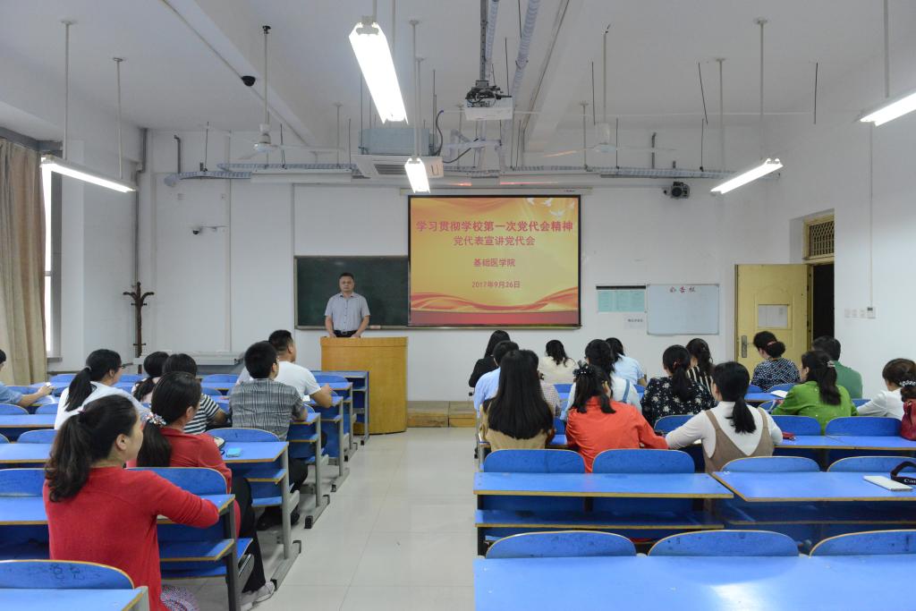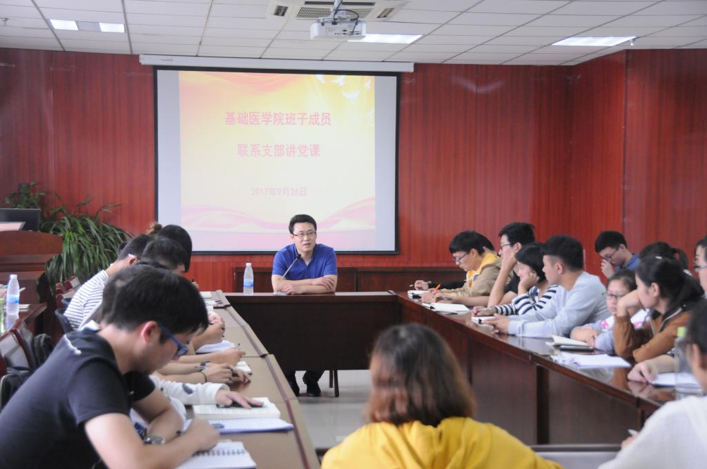 校第一次党代会于2017年8月29日-31日胜利召开,为深入学习宣传贯彻党代会精神,基础医学院班子成员、党代表朱平生、曹珊、高剑峰、李肇进同志于9月26日下午分头到所联系党支部讲党课,宣讲学校一次党代会精神,指导党支部建设工作。