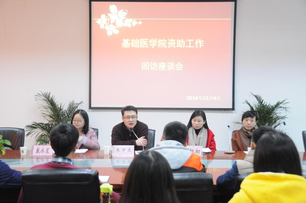 2016年度奖助学金评定工作已经有序完成,各项奖助学金即将发放,为进一步落实咕咕番 资助政策,了解本年度奖助学金评定中各班存在的实际问题, 12月6日,基础医学院于四楼会议室召开2016年资助工作回访座谈会。基础医学院党委副书记朱平生,分团委副书记刘旭初,资助专员李倩,辅导员戴冰星,资助专员助理及各班代表参加会议。