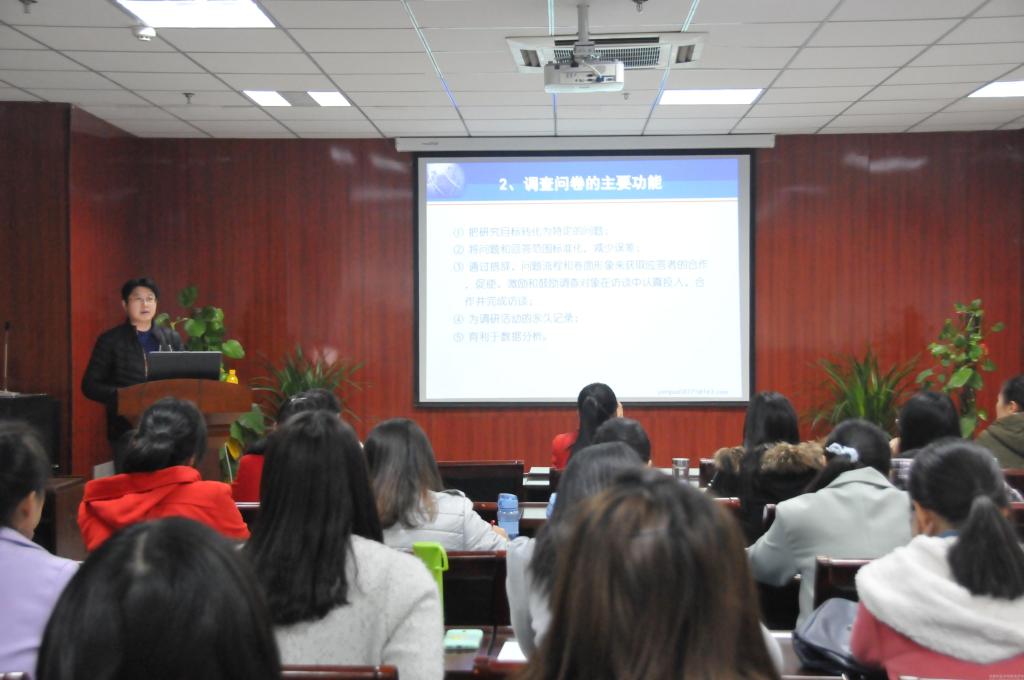 闫老师从“调查问卷概述”、“调查问卷的基本结构”、“调查问卷编制的基本步骤”、“问卷调查的评价”等方面进行阐述。针对“调查问卷”,闫老师从其概念、功能、类型三个方面论述。其中,他结合具体问卷出现的各种问题详细地分析了调查问卷的功能。在调查问卷的基本结构上,闫老师首先强调:问卷务必要在形式上和内容上遵循一定的要求,确保问卷便于作答、便于统计整理。而后,他重点讲解了调查问卷的六大基本步骤:问卷名称、封面信、指导语、主题问题与答案、编码、核查项目。在谈及调查问卷编制的基本步骤时,闫老师简略向同学们讲解,考虑到同学们自身知识水平,在此他结合具体数据进行操作演示,使得同学们便于理解和记忆。最后,闫老师就“调查问卷的评价”这个话题作了精彩的分析。提出了“信度”和“效度”的概念,阐述了两者的分类并进行对比。此外,他还使用对比、举例的方法讲述了制作统计表和统计图时需要注意的事项。同学们听得津津有味,受益良多。