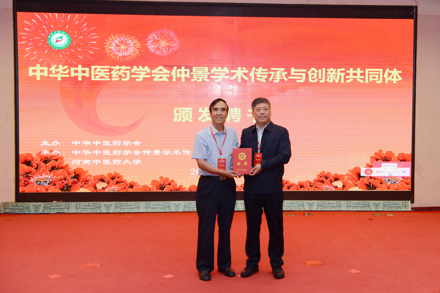 曹正逵监事长为第二届仲景学术传承与创新共同体主席许二平颁发证书