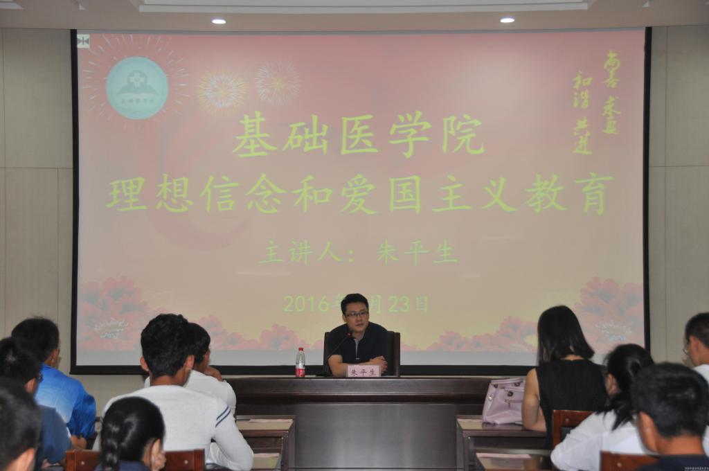 大学生思想政治教育是高校共青团育人工作的核心,是把握高校共青团育人方向的根本保证。9月23日,基础医学院于咕咕番 图书馆第二报告厅为2016级新生举办以“理想信念和爱国主义教育”为主题的思想政治讲座,主讲人是基础医学院党委副书记朱平生教授。