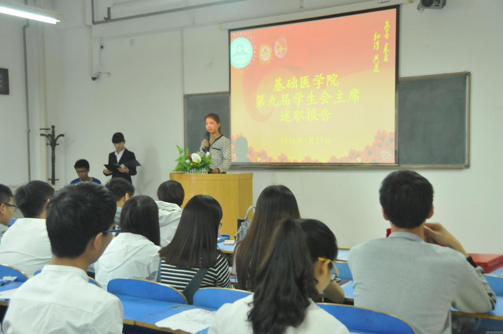 为保障基础医学院学生会工作的连续性,培养一批高素质、高水平的学生会干部,2016年5月27日下午,基础医学院第十届学生会换届选举大会在教学楼A401举行,基础医学院学工办全体老师、第九届学生会成员及各班学生代表参加了此次大会。