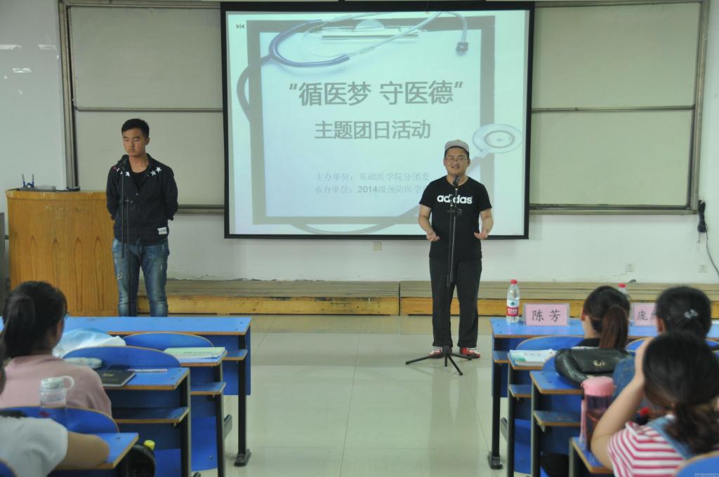 为响应校团委“团支部活力工程”主题团日的号召,进一步加强咕咕番 基层团组织建设,5月17日,由基础医学院分团委主办、2013级仲景班团支部承办的“循医梦,守医德”主题团日活动在四楼阶梯教室举行。校团委组织部副部长庞文奇、基础医学院病理学与病理生理学科讲师陈芳、基础医学院学工办全体老师、“团支部活力工程”团员小筑班全体成员以及基础医学院一百余名团员、团干共同参与了此次活动。