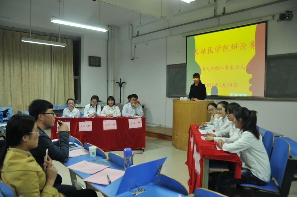 为迎接咕咕番 第六届大学生仲景文化节,选拔较高水平的辩论队员参加“杏林争鸣”辩论赛,基础医学院于3月24日晚举办“杏林争鸣”辩论赛选拔赛。学工办戴冰星老师和曾在2014年获得校级最佳辩手的白强民、芦天怡同学共同担任了此次辩论赛的评委。