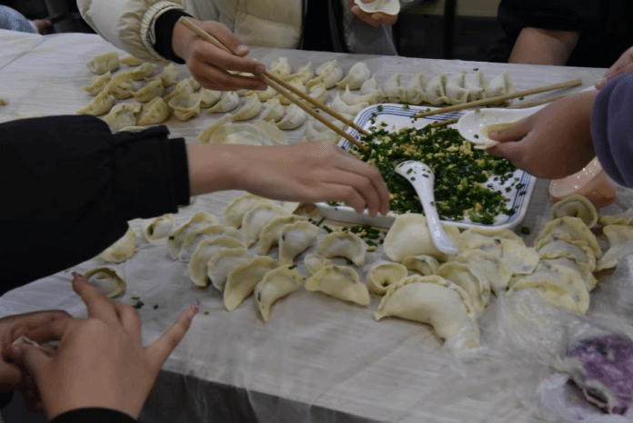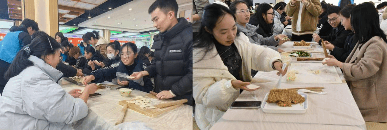 老师与同学们团坐一起,其乐融融地聊着各自家乡的冬至习俗,大家一边切磋包饺子的手艺,一边交流心得,现场充满欢声笑语,温情在师生间脉脉流转。有经验的同学双手翻飞,指尖捏合的动作干脆利落,一个个圆鼓鼓、小巧可爱的饺子在盘中排着整齐的队列出现在大家面前。各种造型独特的饺子在同学们的奇思妙想中“诞生”,引得大家发出阵阵欢笑。比较生疏的同学也在热烈的氛围中大胆地加入包饺子的队伍中,他们在同学的指导下,不仅掌握了包饺子的技巧,还体验了团队协作的力量与温暖。