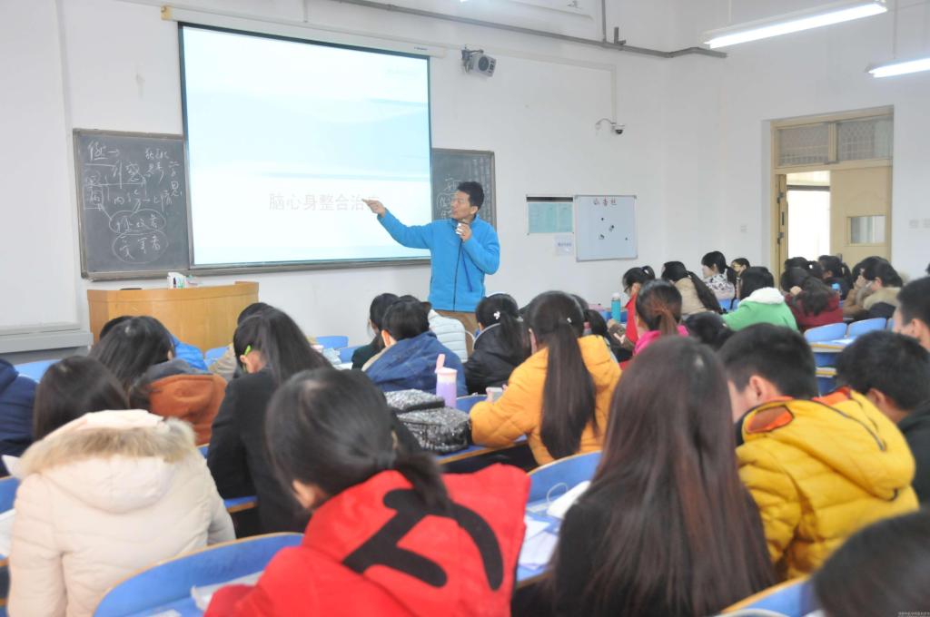 讲座伊始,心理专员李倩老师对许振国教授的到来致欢迎辞。随后,许教授结合多年对《黄帝内经》的研究首先对同学们阐述“病由心发”的思想理念,并提出其独创的“脑心身整合疗法”;接着,许教授引用“通则不痛,痛则不通”强调心理治愈的重要性,并建议同学们“注重整体、放宽心态、适当发泄、均衡营养”从而达到身心健康的目的;最后,许教授向同学们介绍了“断想疗法”、“呼吸疗法”、“按摩疗法”三种处理情绪方式,并现场为大家演示,同时希望同学们加强练习,坚持不懈,注重自己身心发展。