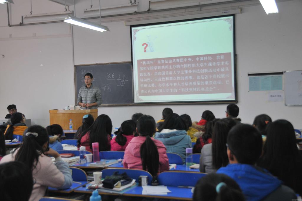 为贯彻落实校团委关于“挑战杯”相关要求,积极开展咕咕番 “挑战杯”工作,2015年11月底,由基础医学院分团委副书记刘旭初老师带领学生会科技部谢天祥、王冲等五位同学组成宣讲队,深入基础医学院各班详解“挑战杯”相关事宜。