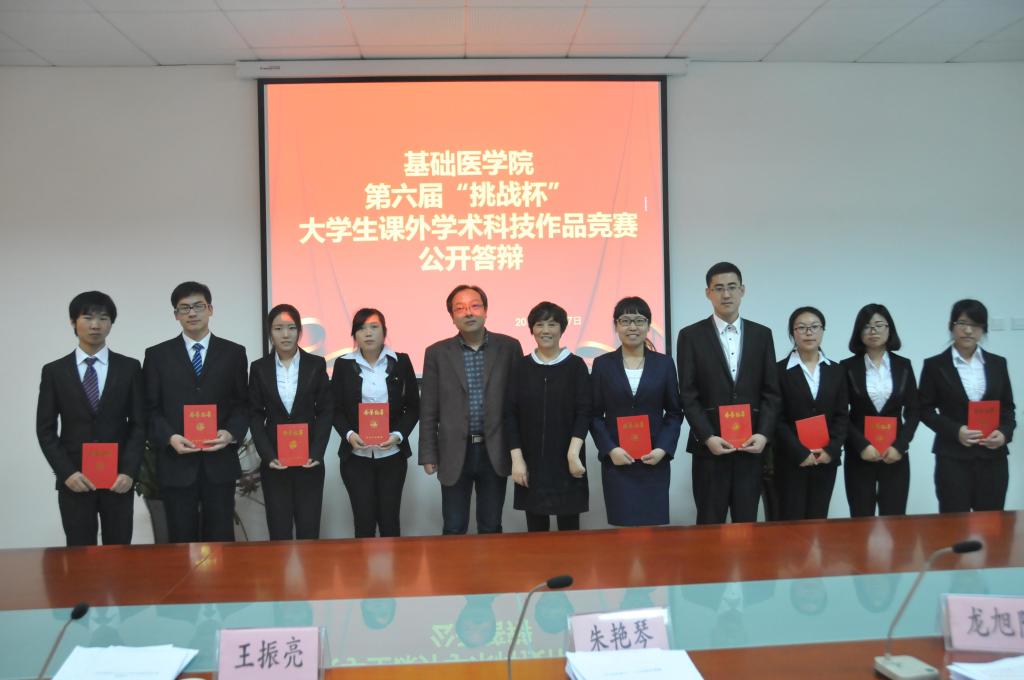 基础医学院第六届“挑战杯”课外学术科技作品竞赛于2014年10月23日正式启动以来,经过组织培训、联系导师、选题立项等前期准备,同学们在寒假期间积极进行社会调查、发明研究、和撰写策划书等工作,截止2015年3月30日为止咕咕番 共收到作品30余份。其中遴选出优秀作品九件参加院、校级答辩。作为挑战杯比赛的重要环节,公开答辩旨在扩大“挑战杯”课外学术科技作品竞赛的影响力,在选拔优秀作品的同时提高学生的表达能力和团队协作能力。基础医学院将在以往参加“挑战杯”工作经验的基础上再接再厉,再创辉煌。(基础医学院分团委)