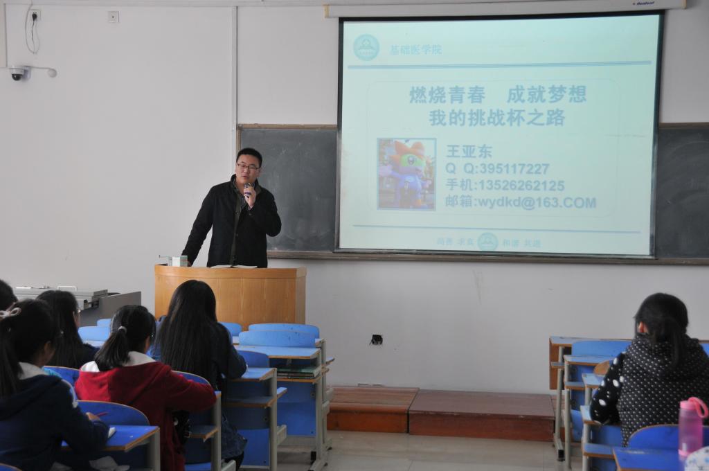 2014年11月27日中午,基础医学院第六届“挑战杯”培训会在教学楼A401举行,针对今年全国大学生课外学术科技作品竞赛相关内容进行专业培训。培训会邀请到校团委宣传部副部长孙河龙老师主讲,另外邀请基础医学院往届挑战杯国赛、省赛获奖者王亚东同学到场交流。基础医学院学工办全体老师、学生干部、挑战杯学生小组成员参加此次培训会。
