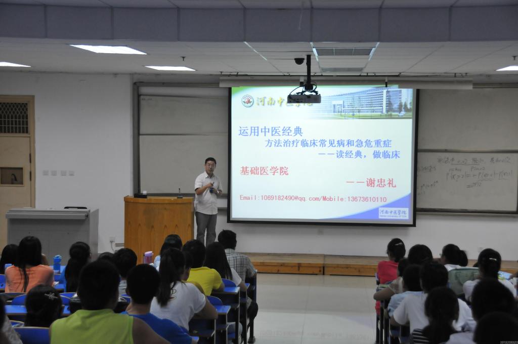 2014年9月26日晚7点,河南省中医药学会仲景学术委员会秘书长,基础医学院中医临床基础学科谢忠礼博士,应基础医学院邀请在教学楼A434教室作关于“运用中医经典方法治疗临床常见病和急危重症”的主题讲座。仲景班全体学生及咕咕番 共计三百余人参加了到场聆听。