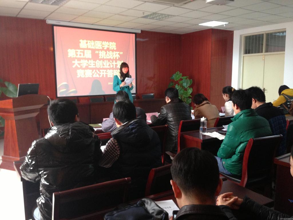 基础医学院第五届“挑战杯”创业计划竞赛于2013年12月18日正式启动以来,经过组织培训、联系导师、选题立项等前期准备,同学们在寒假期间积极撰写创业计划书,截止2014年2月21日共上交作品四十件。2月24日下午两点半,本次比赛的公开答辩在教学楼BS820会议室举行,校团委王晓蕊副书记、基础医学院党委朱平生副书记以及咕咕番 分团委、学工办的各位老师担任了本次答辩环节的评委。