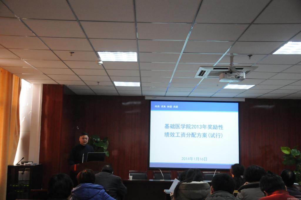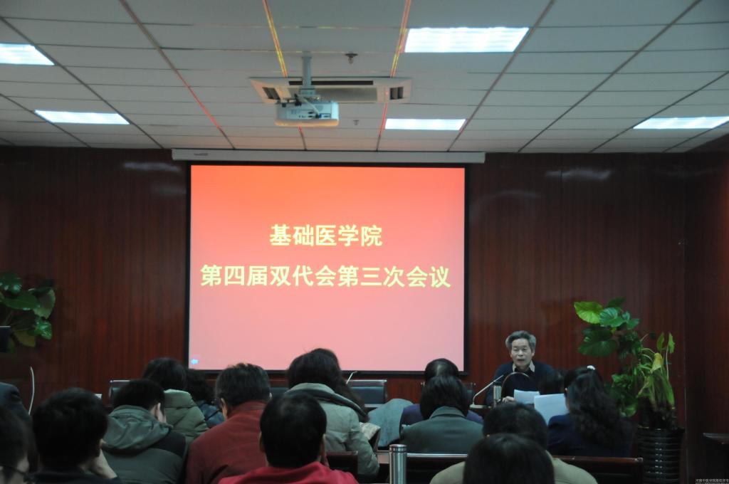 2014年1月16日下午,基础医学院第四届双代会第三次会议在新校区BS820会议室隆重召开。基础医学院的42名教职工代表和2名特邀代表参加本次会议。基础医学院党委书记马相奇同志主持会议。
