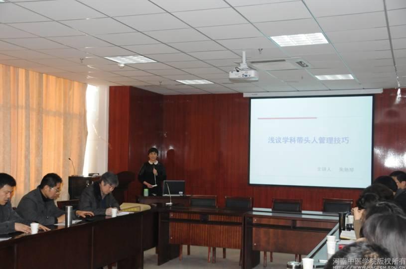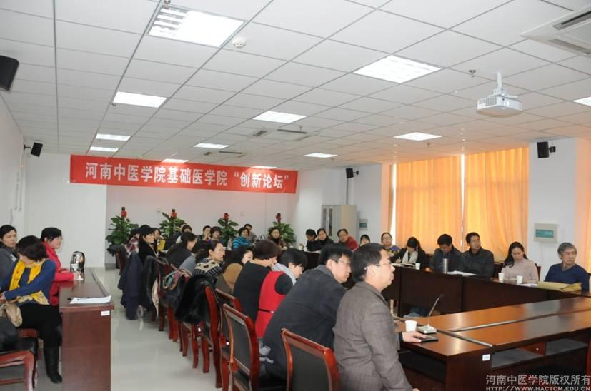 2014年1月13日下午,基础医学院“创新论坛”在咕咕番 新校区教学实验楼举行,河南省第八批重点学科基础医学学科带头人朱艳琴教授应邀做客论坛,并做了题为“浅谈学科带头人管理技巧”的讲座,基础医学院各学科主任、重点学科带头人及学科秘书等40余人参加了本次讲座,讲座由基础医学院高剑峰副院长主持。