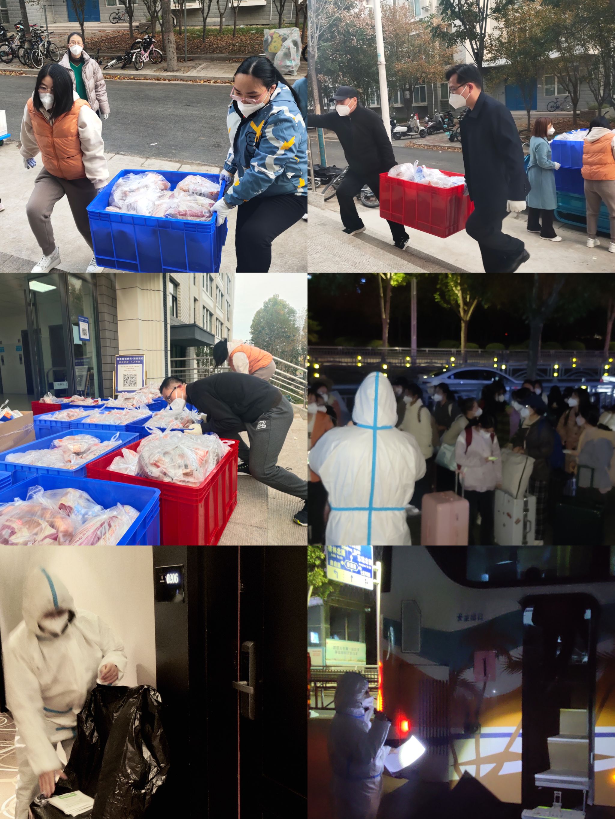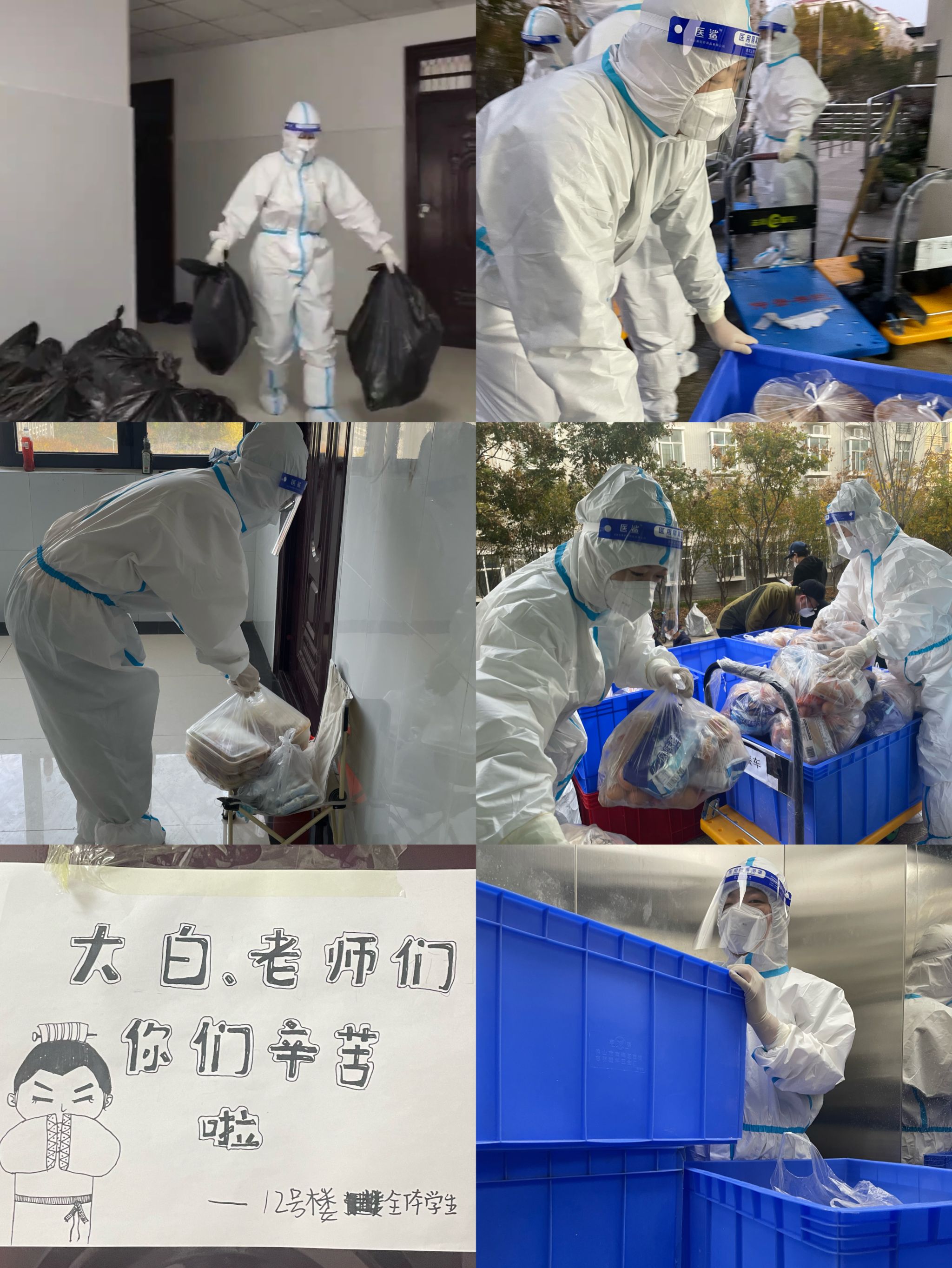 周密部署,有序行动。为科学管理、精准防控、提高效率,十二号楼保障组明确分工,迅速分为餐饮配送组、餐饮分发组、垃圾清运组、消杀防疫组、联络宣传组和后勤保障组,全力做好十二号楼全体学生以及全体志愿者的安全与生活保障工作。各小组团结协作、科学有序,严格遵照楼内楼外双闭环管理,物品交接必先消杀,实现楼内外人员无接触,楼内师生无接触,最大限度的控制疫情传播。为准确掌握学生情况,摸排学生数据,防止疫情外溢,学院辅导员队伍在十二号楼已有确诊病例的情况下全员入住楼内,处理楼内事务并保障与外部工作的对接。