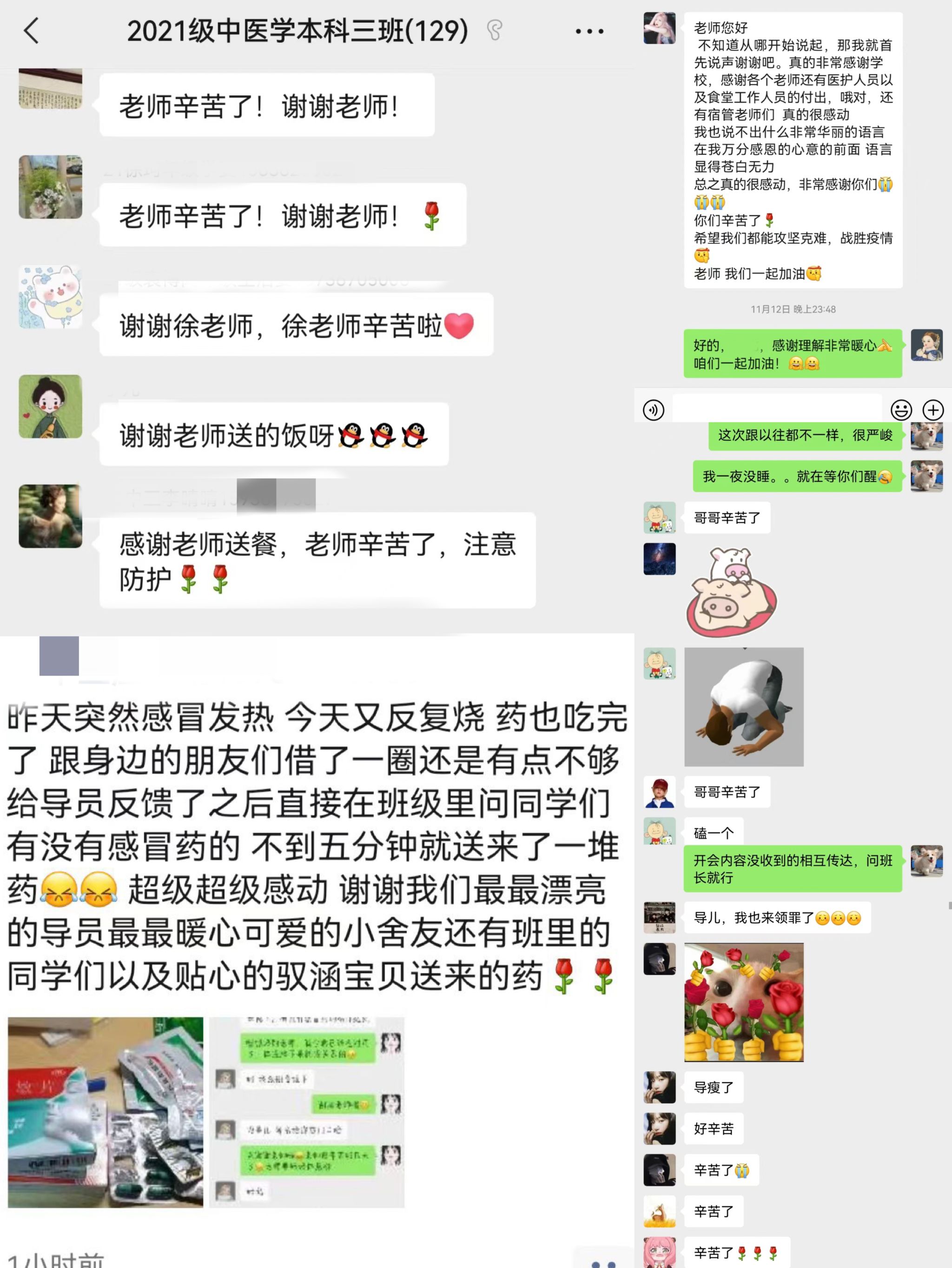 真情相系,同舟共济。学院全体教师竭力同心,多渠道掌握学生思想动态,多方位引导学生正向思维。用温情淡化疫情带来的阴霾,让学生沐浴关爱的阳光。三尺讲台上坚守,疫情“战场”中冲锋。老师们的辛苦付出深深打动了学生,无形中鼓舞了学生坚定抗疫必胜的信念,拉近了学生心与心之间的距离。老师们的言传身教,学生看在眼里,暖在心里,尽力配合老师的工作,在与自己朋友家人的聊天中毫不吝啬对老师的赞扬之词。