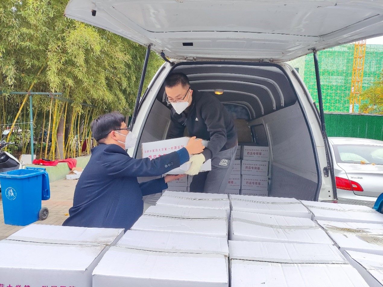 11月10日晚,学院党政办副主任史占江老师从家中赶来支援,开始统筹送餐组的工作,11月11日金匮教研室孙宏昌老师加入送餐组,随后学院教师郭凤鹏、张国松、刘飒、谢苗、霍磊、高卫平等纷纷从家中赶来支援。大家在史占江老师的安排下,分为两个小分队,一队由史占江老师带领在餐厅装车,一队由李艳老师带领在12号楼前卸车。早上6:50开始运送早餐,中午11:30开始运送午餐,下午5:30开始运送晚餐,送餐工作开始有序进行。在餐间的空余时间,老师们顾不上休息,继续从后勤搬运防护服、手套、口罩、酒精等急需的防疫物资,并为学生搬运和分发中药、牛奶、水果、方便面等。学院教师大多承担着本科生的教学任务,为了保障送餐工作,老师们把课调到晚上,白天化身搬运工为学生送餐,晚上又回到三尺讲台为学生上网课,在送餐的路上,常有学生在窗边向我们挥手,工作虽然辛苦,能得到学生的理解和认可,老师们都感到所有的付出都是值得的。