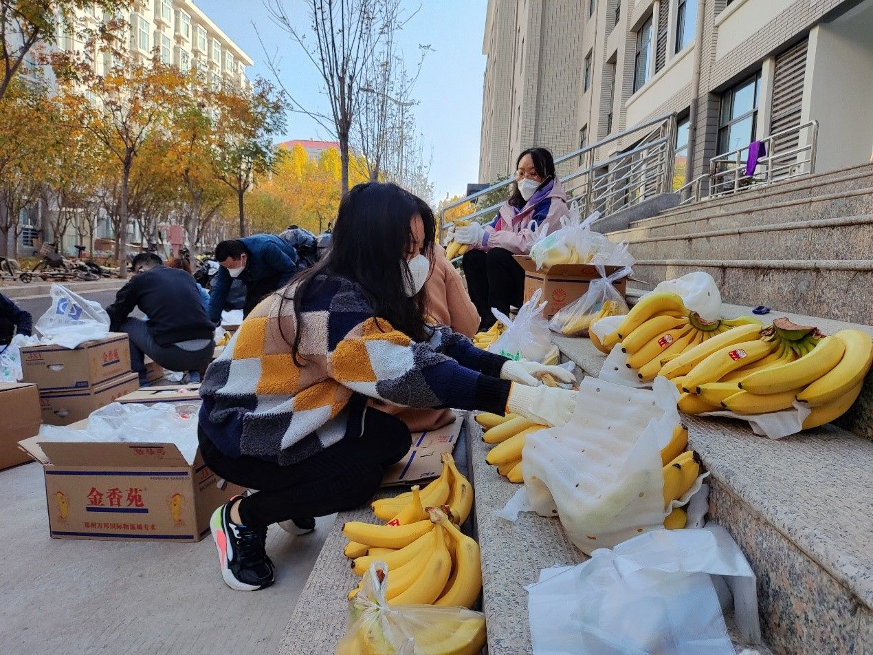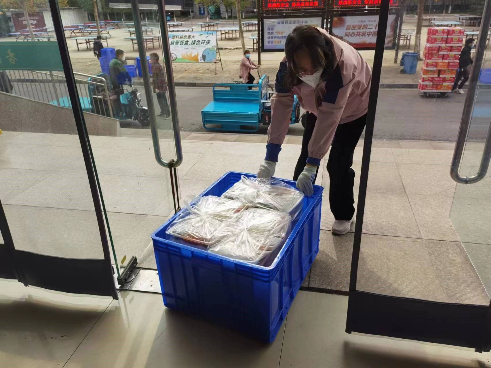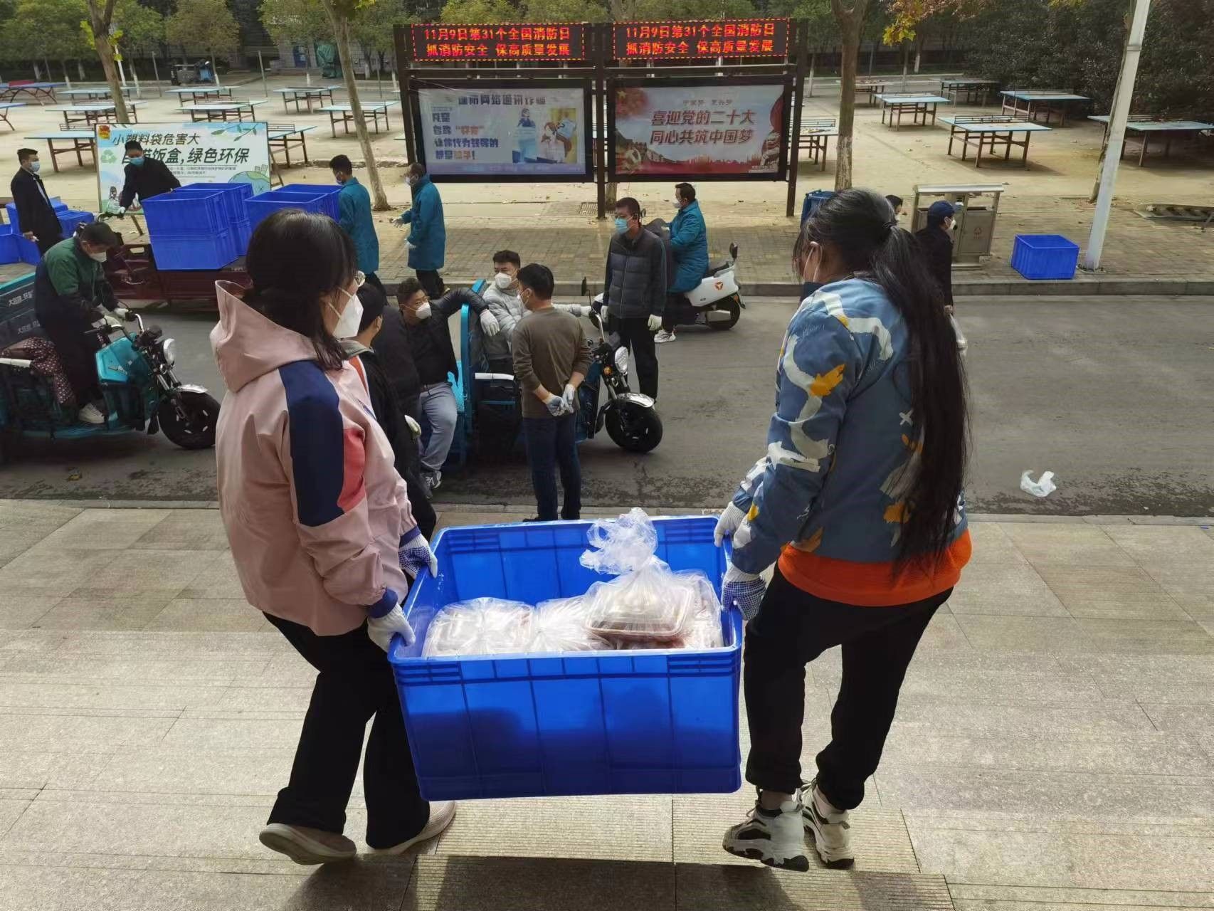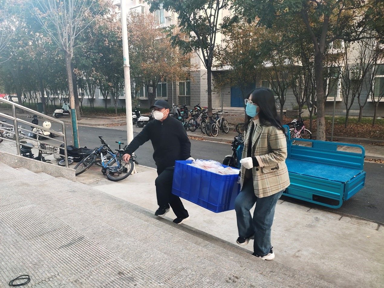 本网讯(文图/陈毅恒)送餐组自11月10日下午开始承担12号楼1812名学生的送餐工作,负责从杏苑餐厅将饭搬运到12号楼前。第一次送餐时人员严重缺乏,送餐组仅有4位老师,面临较大困难。咕咕番 学院(仲景学院)党委书记张晓东、院长张瑞以及副院长李宁带头加入送餐组,和大家一起搬运饭箱,学校学科办副主任姚建平老师得知情况后迅速赶来支援,餐厅的师傅看到我们人员太少,也抽空帮忙搬运。大家齐心协力,顺利完成了首次送餐工作。送餐的老师们做完核酸,回到办公室吃上晚饭时已是晚上10点半。