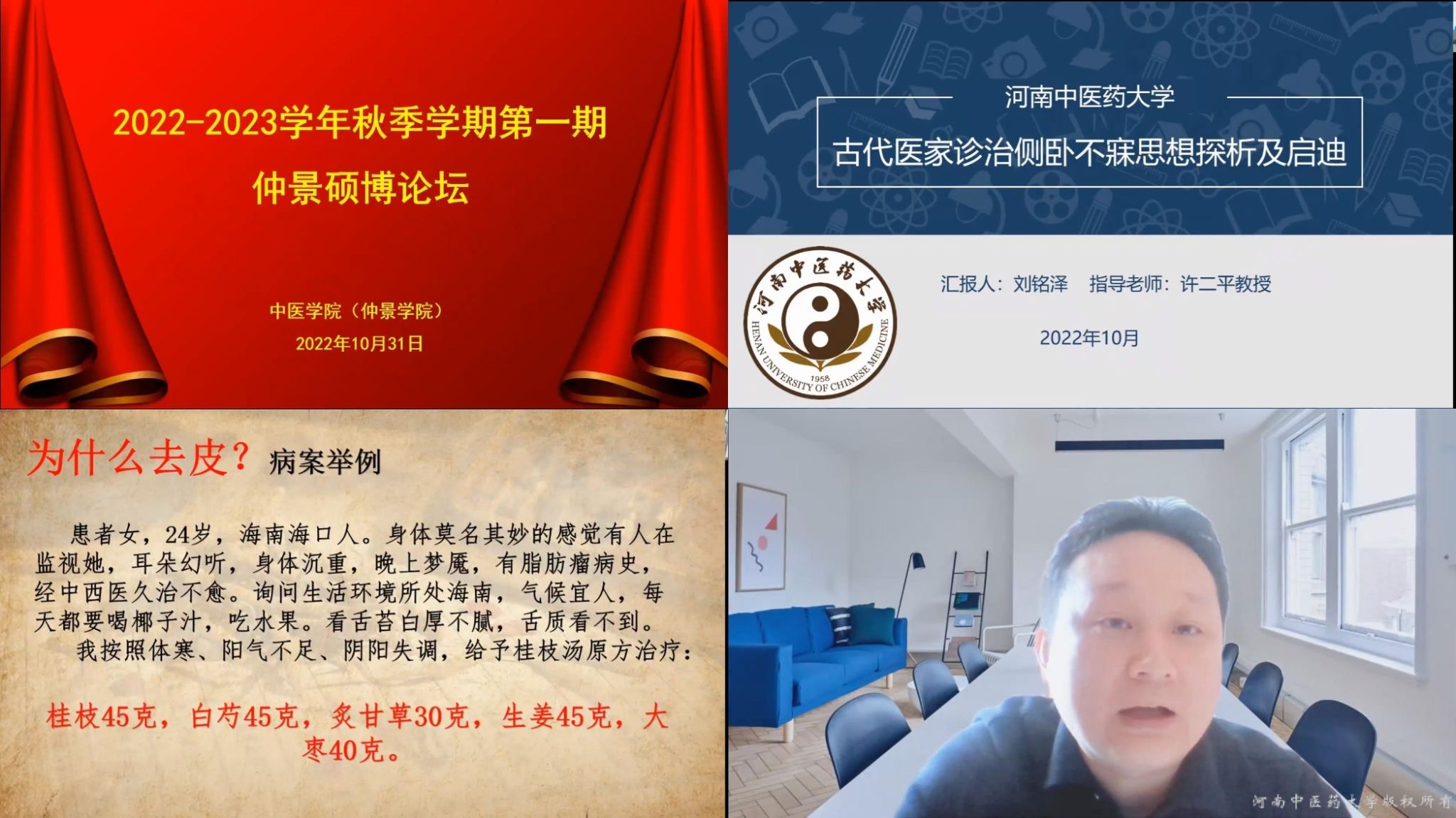 论坛中2022级博士研究生卢小蓓介绍了香砂六君子的研究进展;2020级硕士研究生邢铭瑞对古籍文献检索方法进行了归纳和总结;2021级硕士研究生张琳阐释了承气汤方重点不在泻下的观点;2021级硕士研究生刘铭泽分享了古代医家诊治侧卧不寐思想探析及启迪。2021级硕士研究生王晨阳浅谈了《伤寒论》中几味中药的炮制和应用体会。2021级硕士研究生吉妙琳分享了宋代不同人群养生的研究进展。