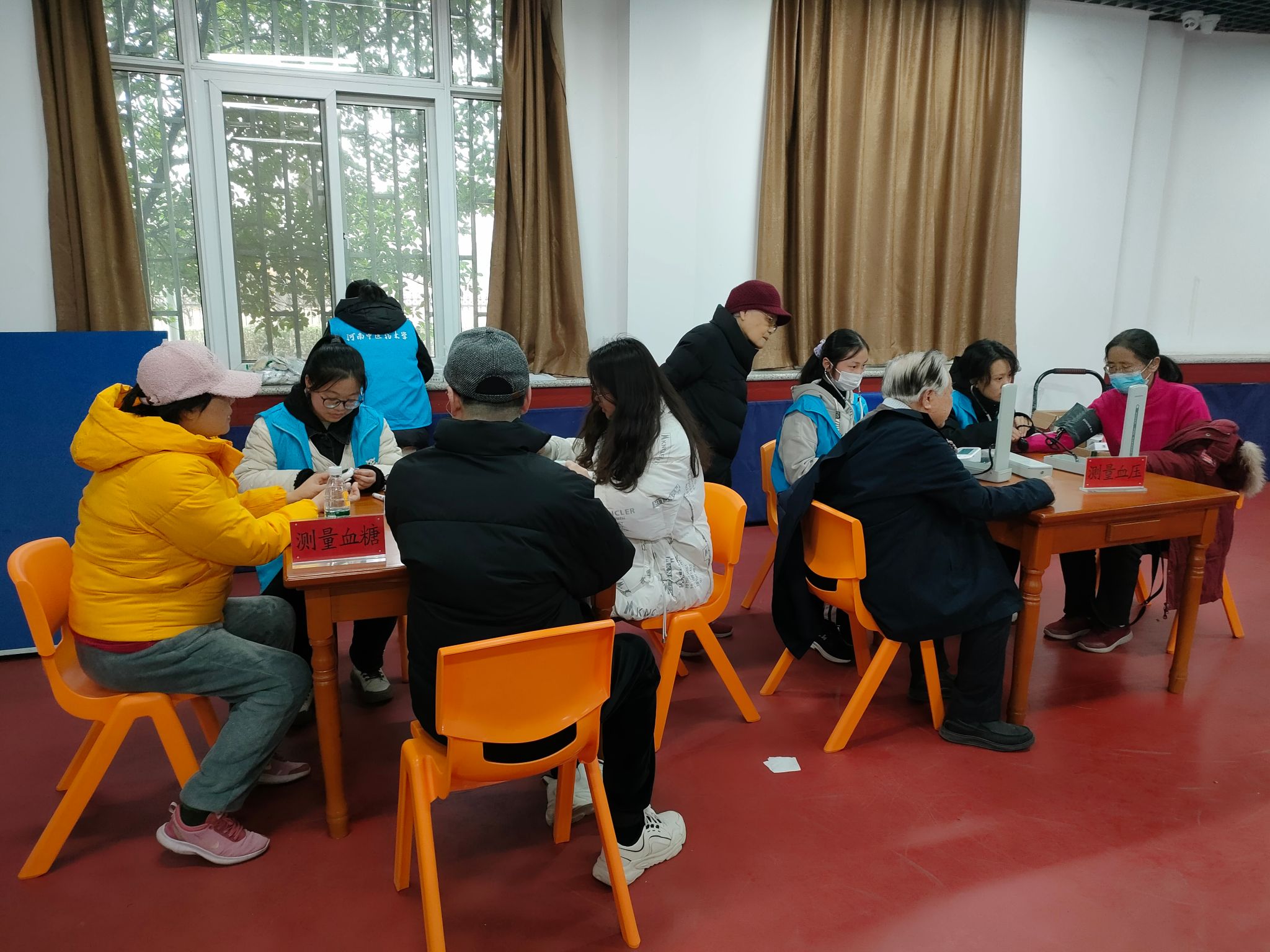 学生志愿者为居民测量血压、血糖