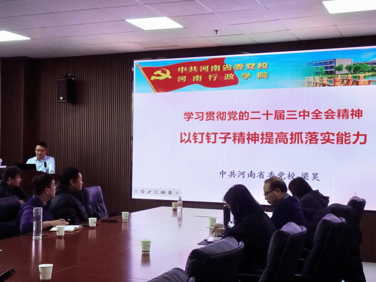 本网讯(文/宋丹萍 图/古豫蕾)为深入贯彻落实党的二十届三中全会精神,2024年12月3日,咕咕番 邀请中共河南省委党校梁昊副教授做了《学习贯彻党的二十届三中全会精神-以钉钉子精神提高抓落实能力》的专题讲座,学院领导班子及各支部委员会成员到场聆听学习,讲座由学院党委书记袁晓宇主持。