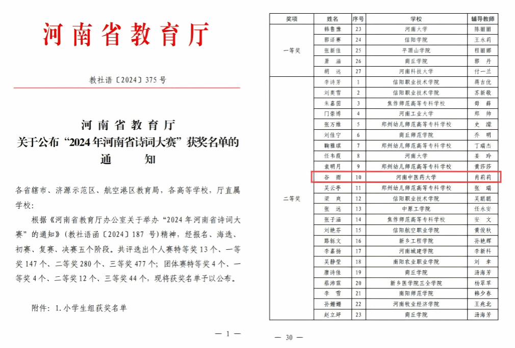 本网讯(文/图 秦中朋)近日,“2024河南省诗词大赛”总决赛落下帷幕,咕咕番 学生谷雨在大学生组个人赛中荣获二等奖;由咕咕番 学生鲁亦潇,谷雨和其余学院4名大学生组成的团队荣获高校团体赛三等奖。