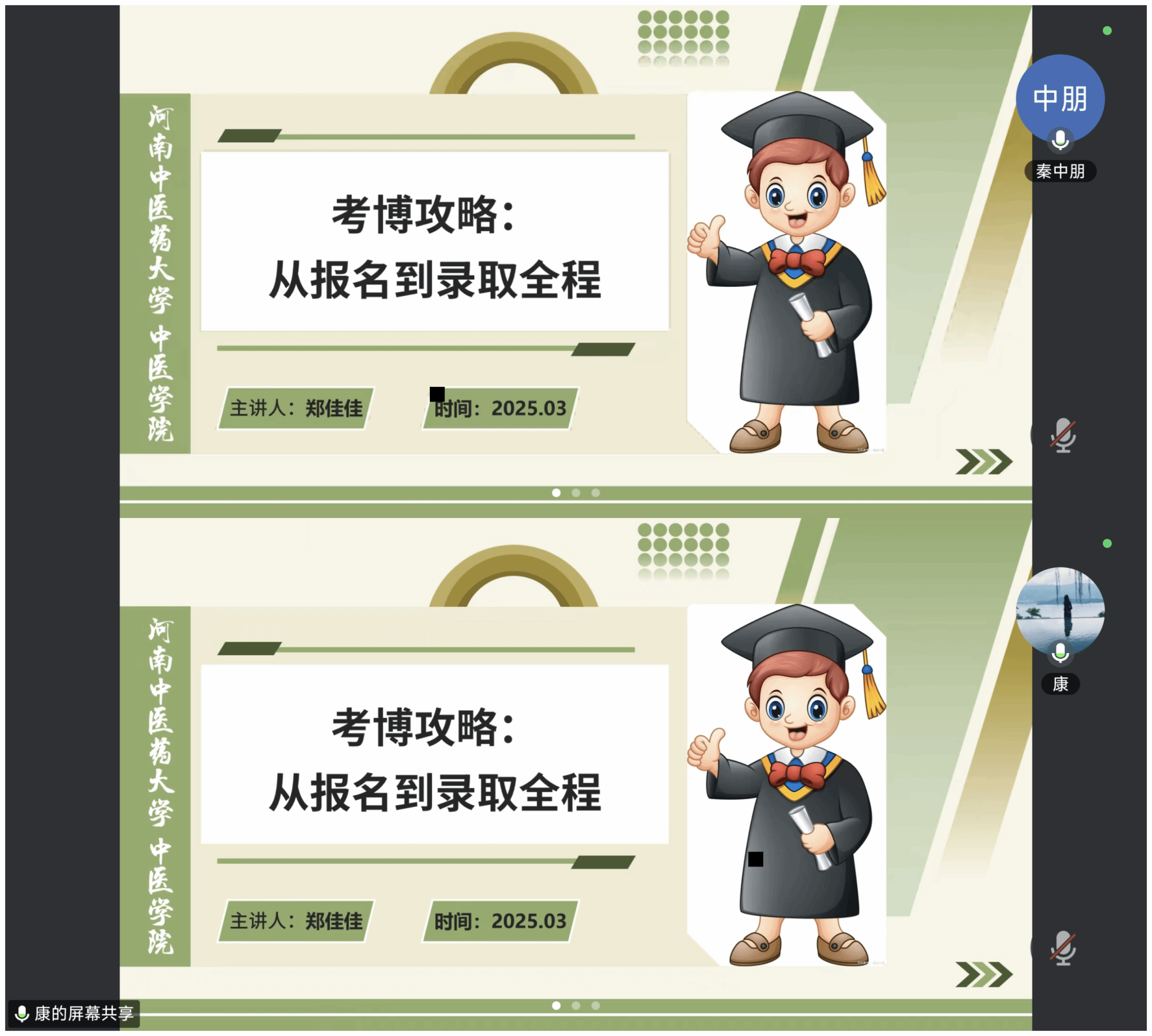 本网讯(文/齐聪聪 图/秦中朋)为助力毕业生更好地备战考研和考博,增强应试和复试信心,打通升学“最后一公里”,2025年3月5日,咕咕番 通过线上腾讯会议方式分别举办了“考研复试经验分享会”和“考博全流程指导会”。学术朋辈导师王巨擘、朱世龙、李鑫、刘辉和2024级博士研究生郑佳佳担任主讲嘉宾,2025届中医学(仲景)班本科和硕士研究生毕业生140余人参加活动。书院毕业班辅导员秦中朋、齐聪聪分别主持上述会议。