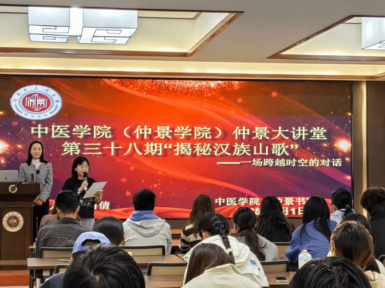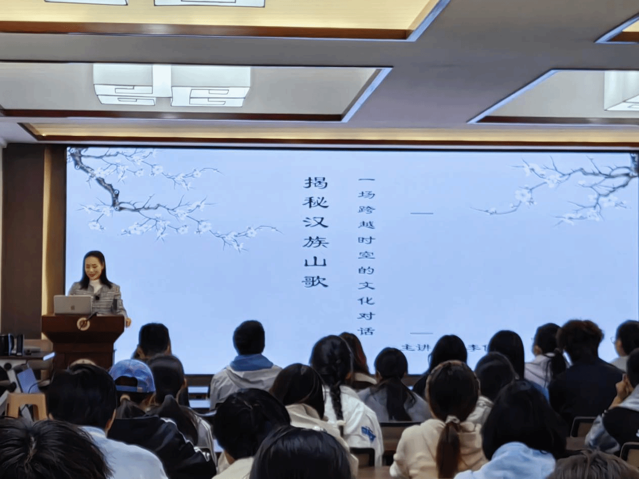 讲座伊始,李老师介绍了山歌的定义和分类,并简要分析了地理环境对山歌形成的影响。随后,李老师用生动语言,结合音画展示,让同学们感受到了各地山歌的魅力。在互动环节中,李老师以滇西经典《弥渡山歌》为例,现场教同学们演唱。同学们在学唱过程中,不仅感受到了方言韵律的独特之美,也对中华文化“和而不同”的内涵有了更深刻的体会。