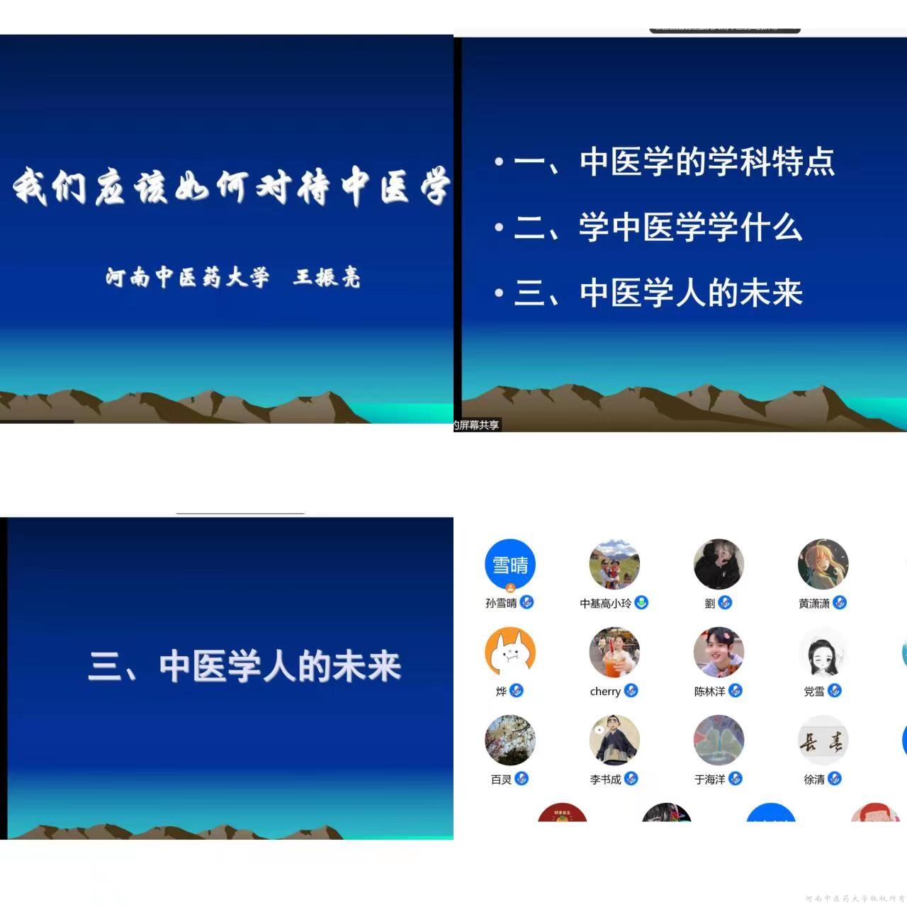 王振亮教授围绕“中医学”这个话题与同学们展开了一场“交心的会谈”,并从三个方面进行了深入的阐述:一是从整体观、平衡观、藏象、取类比象等方面展开了细致的讲解,深入阐释中医学的学科特点;二是从中医学学什么出发,叮嘱同学们学习和树立中医的思维方式,从而深刻理解中国的传统文化内涵,同时也要学习医疗技术,坚持理论与实践相结合;三是从中医学的未来发展出发,要求同学们传承精华,守正创新,既要融会贯通中医学的理论基础、又要善于创新,不断拓展现代科学技术方法和手段,利用科学技术不断阐释朴素的中医药原理,让中医药发展薪火相传。