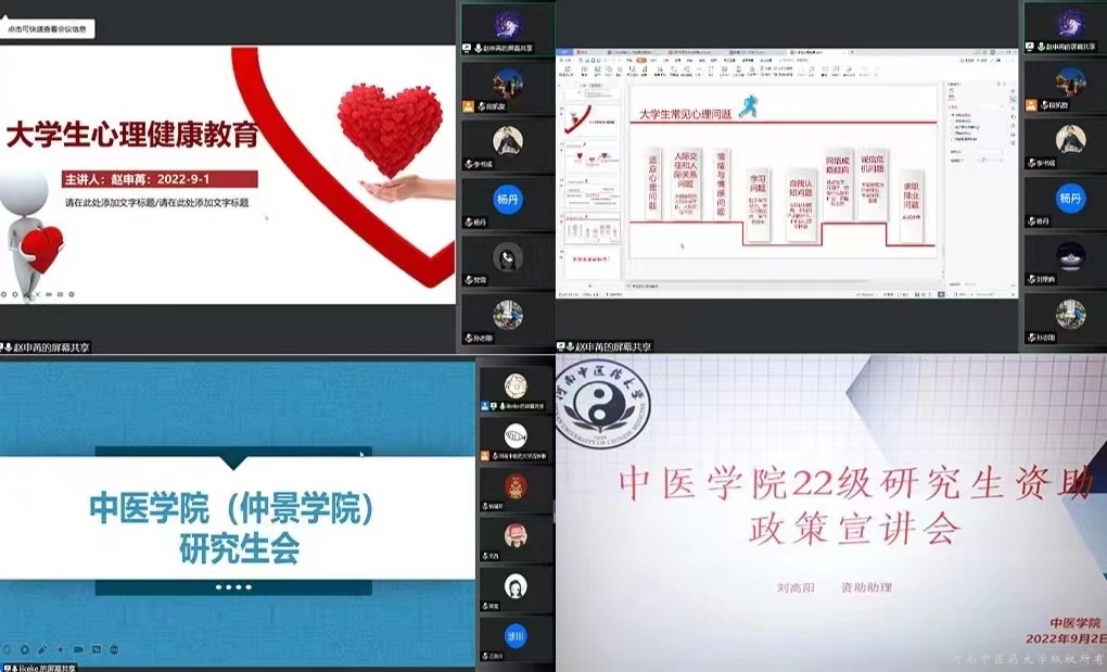 本网讯(图/文 刘淘淘 )为全面落实学校秋季学期工作中入学教育内容的安排,引导2022级研究生尽快适应学校生活,加强研究生的心理健康教育,帮助同学们熟悉资助贷款政策、全面了解院研究生会组织架构与工作职责。2022年9月2日上午,咕咕番 学工办围绕心理健康教育、学校资助贷款政策、院研究生会职责等内容,集中开展线上新生入学教育工作。