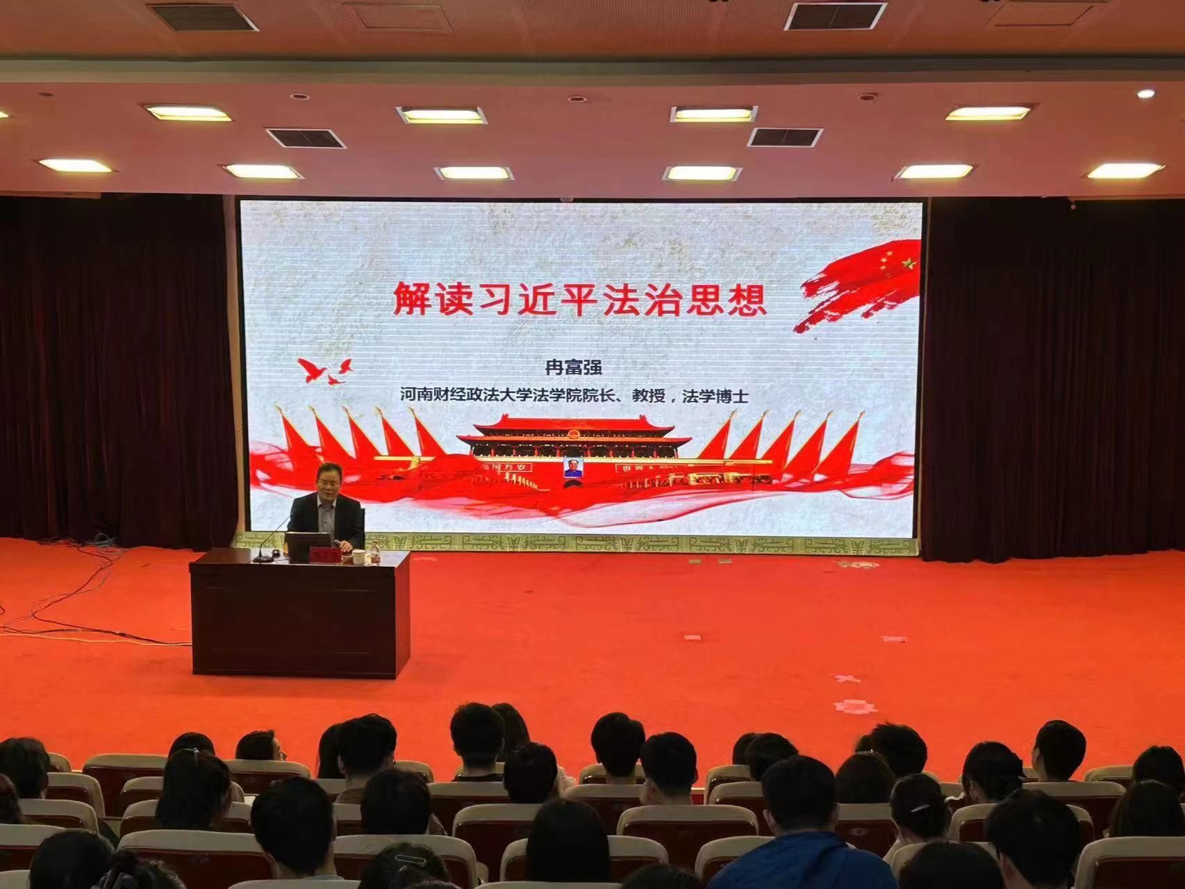 本网讯(文/图 赵申苒)为持续深入宣传贯彻党的二十大精神,系统学习习近平法治思想,提高师生法治素养,咕咕番 于2023年4月19日下午在校图书馆第一报告厅开展专题辅导报告。本次讲座特邀河南财经政法大学法学院院长、教授、法学博士冉富强主讲,咕咕番 师生党员代表300余人参与学习。学院副院长李宁主持。