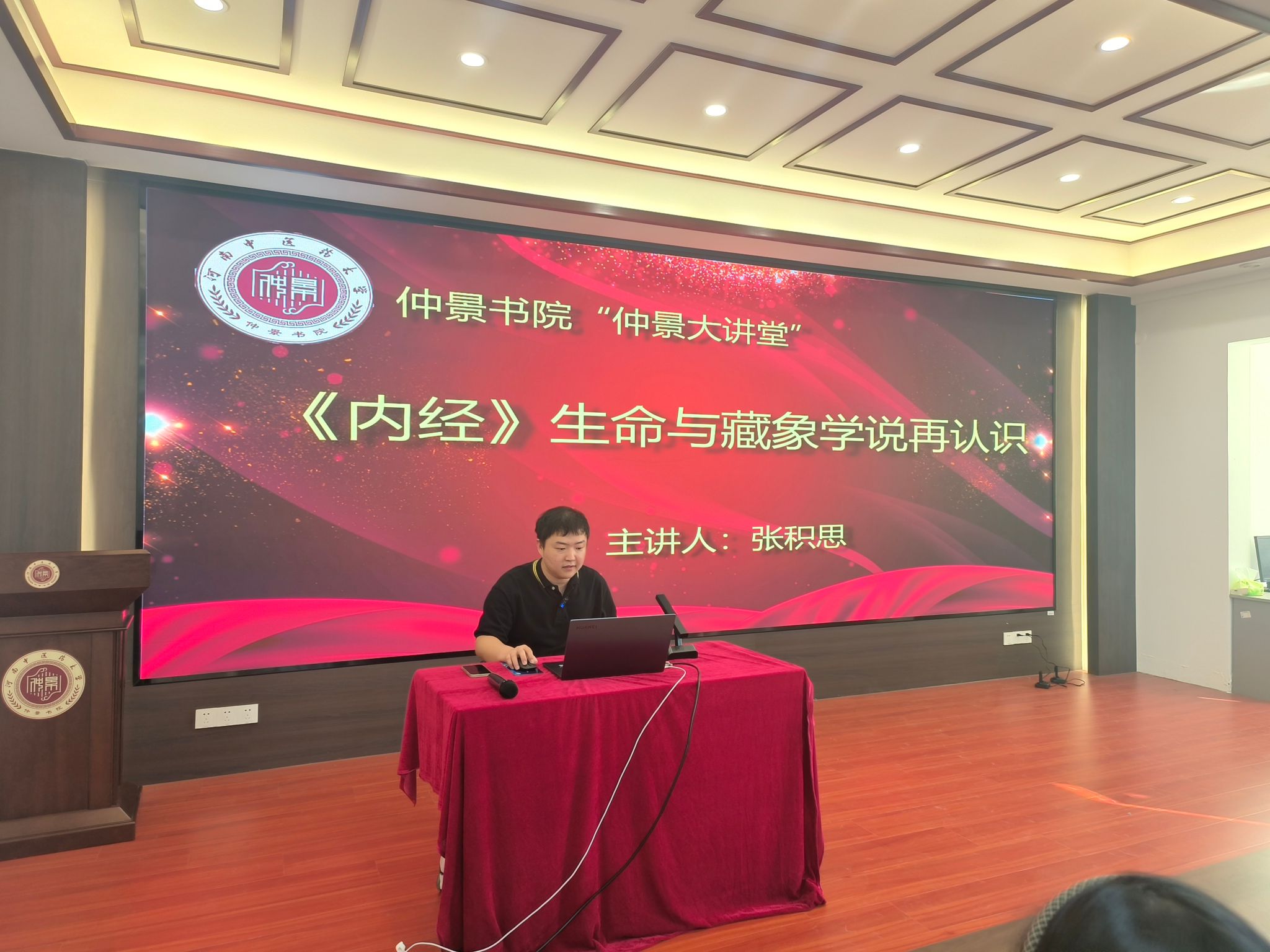 张积思老师以“《内经》生命与藏象学说再认识”为主题,抛出三个问题,向同学们进行讲解:一、通过举例,说明中医朴素是能够从生活中获取的,中医深奥是因为文献限制,记录太少;二、以“阴阳、四气、形体的由来、整体观念”向同学们介绍了生命是怎样形成的;三、指出《内经》在流传时发生变故,可能夹杂了个人见解。张积思老师对于广大师生在中医学道路的探索给予了“以朴素的中医思维做铁杆中医、以辩证的治学思维研中医经典”的期望。
