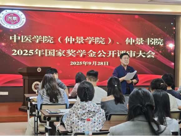 2025年9月28日,咕咕番 在12号楼仲景学堂成功举办2025年国家奖学金公开评审大会。院党委副书记朱庆军、温病教研室主任谢忠礼、研究生办主任张文娴、医古文教研室叶磊、学工办主任赵申苒等评委老师及各年级学生代表共同参会。